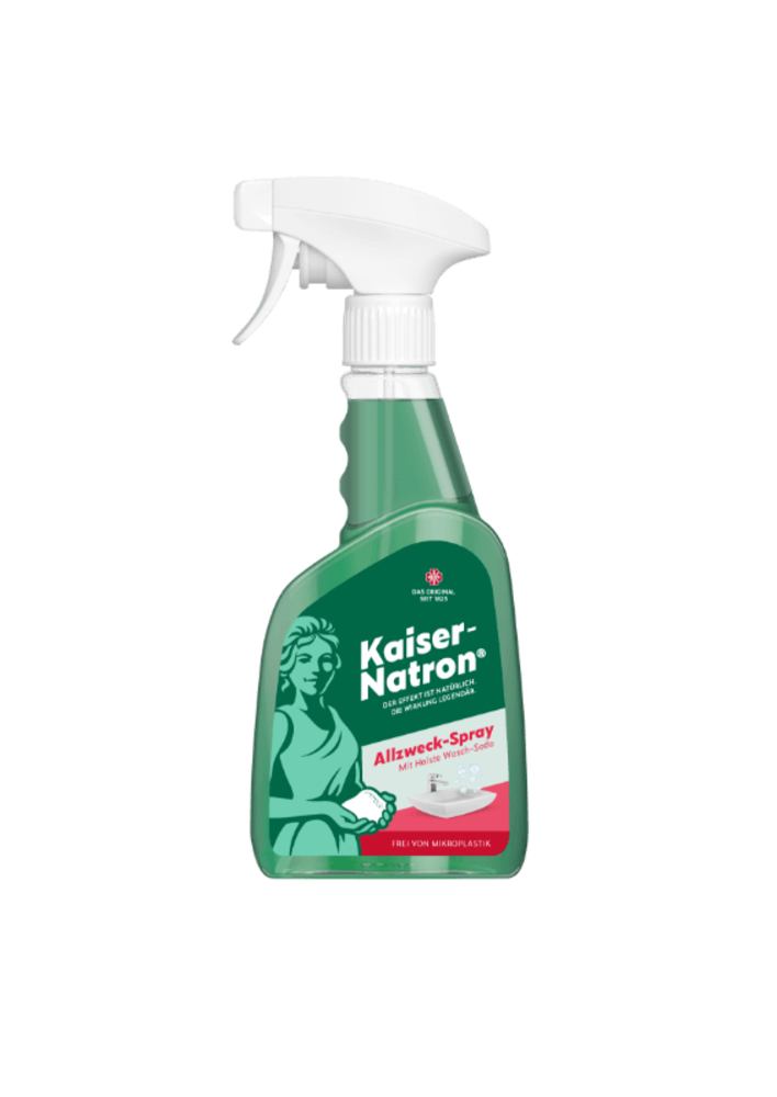 Düse drehen, bis Sprühsymbol „ON“ oben steht. Kaiser-Natron® Allzweckspray aufsprühen und mit einem trockenen Tuch sauber wischen. Im Zweifelsfall vorher an einer nicht sichtbaren Stelle testen!