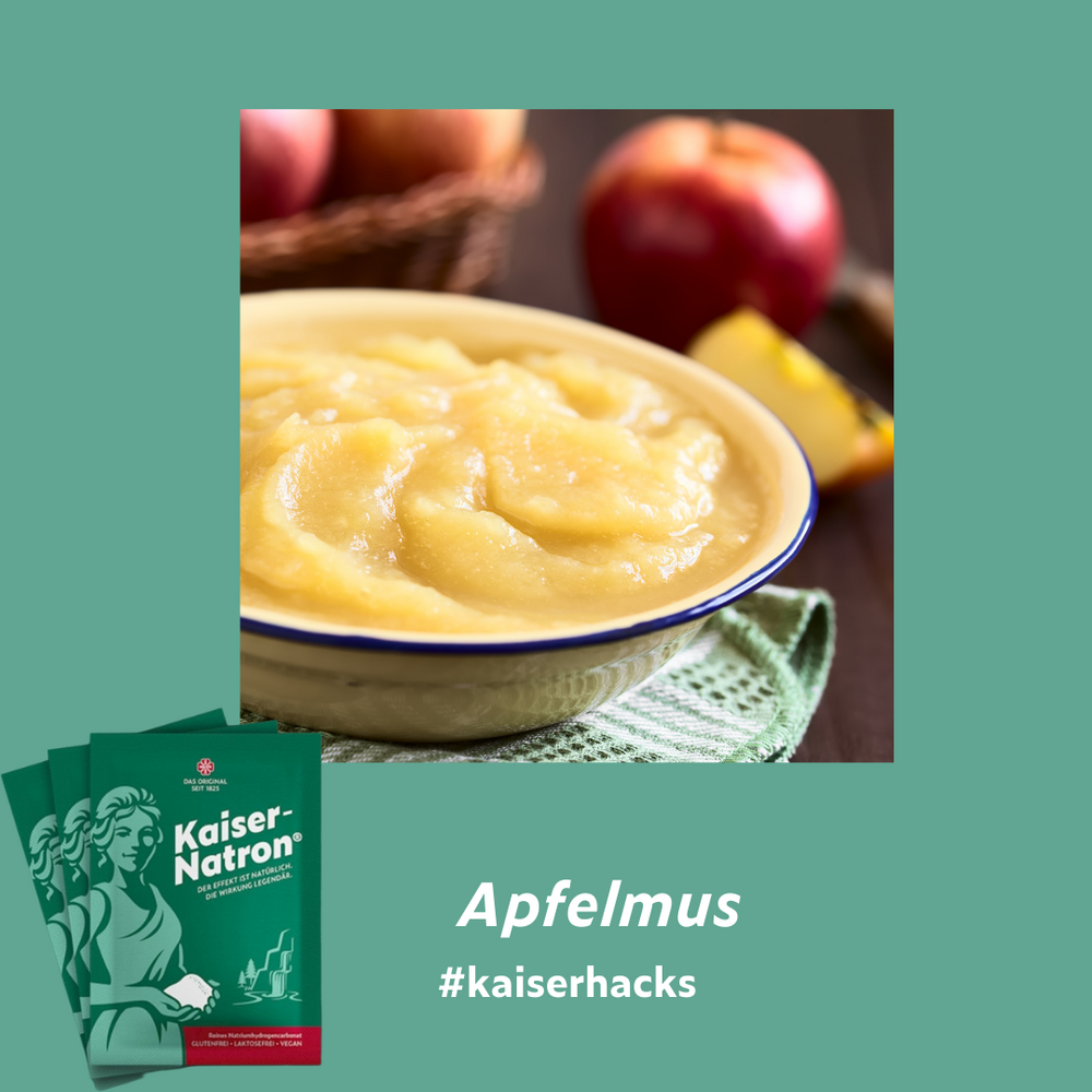 An apple a day, keeps the doctor away… Wie gut, dass nun langsam die Apfelernte anfängt. Da nicht alle Äpfel sofort verzehrt werden können, kann daraus köstliches Apfelmus gekocht werden. Damit das Apfelmus seine schöne Farbe behält und sich nicht bräunlich verfärbt, könnt Ihr beim Kochen eine Messerspitze Kaiser-Natron® zufügen. Geschmacklich macht es keinen Unterschied, aber das Auge isst ja immer mit. Und in den kommenden Monaten könnt Ihr dann leckeres Apfelmus zu Kartoffelpuffern oder Kaiserschmarrn genießen oder damit veganen Kuchen backen.