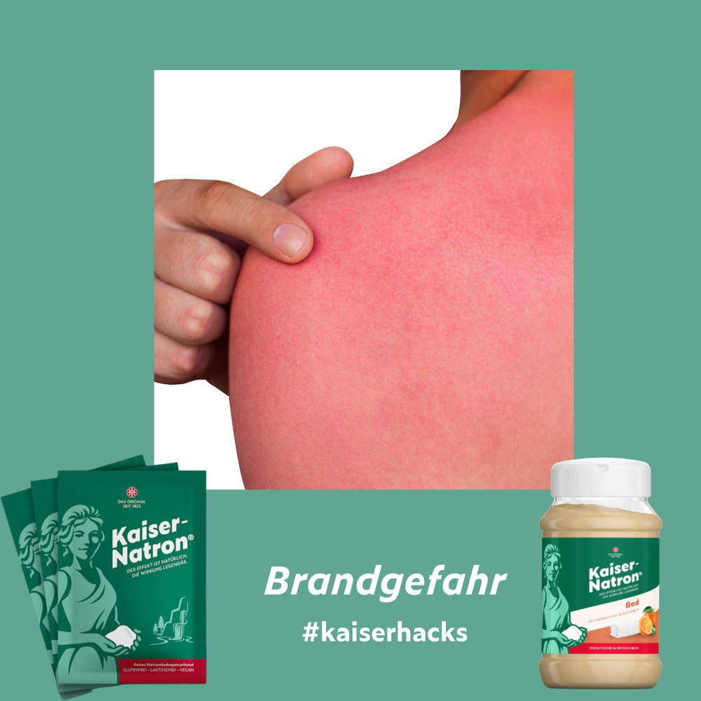 Ups, jetzt ist der Sommer doch plötzlich wieder zurück und wir können die Sonne endlich wieder genießen. Habt Ihr denn auch an Sonnenschutz gedacht oder seid ihr nun rot und habt einen Sonnenbrand? Dann haben wir einen Kaiserhack für Euch. Ihr verwöhnt Eure Haut mit einem angenehmen Bad. Alles was Ihr braucht sind eine Badewanne voll Wasser, ½ Tasse Kaiser-Natron® oder Kaiser-Natron® Bad und 15 Minuten Zeit. Anschließend den Körper mit klarem Wasser abspülen. Das Bad täglich so lange wiederholen, bis die verbrannte Haut geheilt ist. Und beim nächsten Mal besser auf den Sonnenschutz achten!