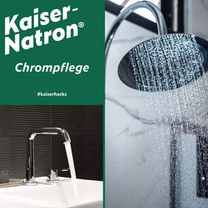 Dieser tolle Augenblick, wenn nach dem Putzen die Chromarmaturen, Duschköpfe und Wasserhähne glänzen… Das ist Wellness für die Augen. Aber leider bereiten die meisten Putzmittel nicht gerade Wellnessmomente für Eure Hände und können die Haut austrocknen. Außerdem belasten viele Reiniger die Umwelt und verursachen Verpackungsmüll. Dabei kann es so einfach sein. Denn mit ein bisschen Natronpulver auf einem feuchten Lappen erzielt Ihr genauso gute Ergebnisse. Natron wirkt nicht abrasiv und schont somit Eure Armaturen. Natürlich könnt Ihr ebenso Eure Waschbecken reinigen.