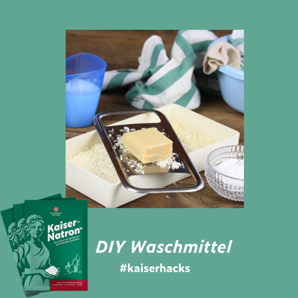 Was gibt es schöneres als frisch gewaschene Wäsche oder ein frisch bezogenes Bett? In der Drogerieabteilung habt Ihr die Qual der Wahl vor dem Waschmittelregal. Wusstet Ihr, dass die meisten Waschmittel Duftstoffe, Konservierungsstoffe, Streckmittel und Rieselhilfen enthalten? Duftstoffe können allergische Reaktionen hervorrufen, Konservierungsstoffe können die Haut schädigen und Streckmittel und Rieselhilfen können die Umwelt stark belasten. Wir haben einen Kaiserhack, der eure Wäsche ohne dies alles frisch und sauber macht. Ihr benötigt dazu 50 g geriebene Kernseife, 100 g Holste Waschsoda und 100 g Kaiser-Natron®. Alle Zutaten werden gut vermischt und pro Waschladung gebt Ihr 2 Esslöffel ins Waschmittelfach der Waschmaschine.