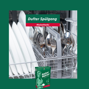Kennt Ihr das, wenn die Geschirrspülmaschine sich langsam füllt und das dreckige Geschirr unangenehme Gerüche in der Geschirrspülmaschine verursacht? Dann könnt Ihr unseren Alleskönner Kaiser-Natron® als Spülmaschinen-Deo nutzen. Für diesen Kaiserhack streut Ihr 1 EL Kaiser-Natron® auf den Boden der leeren Spülmaschine und die Gerüche werden neutralisiert. Kleiner Nebeneffekt: Das Natron hilft während des Spülgangs beim Entkalken des Wassers und der Bedarf an Klarspüler wird reduziert.