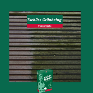 Wir mögen die Farbe Grün bekanntermaßen sehr gerne. Was wir aber gar nicht mögen, sind Grünbeläge im Garten an Holz, Stein oder Beton. Grünbelag kommt vor allem nach dem Winter vor, aber auch im Sommer an Stellen, die feucht sind und wenig Sonne abbekommen. Zum Schutz der Umwelt und der Tiere sollte der Grünbelag mit natürlichen Mitteln entfernt werden. Unser Zauberpulver Kaiser-Natron® hilft Euch dabei. Ihr benötigt Kaiser-Natron® und mehrere Liter kochendes Wasser, pro Liter Wasser 2 EL Kaiser-Natron®. Beides gut vermischen, großzügig auf den Grünbelag geben und über Nacht einwirken lassen. Am nächsten Tag bürstet Ihr die Flächen mit einer harten Bürste oder Besen ab und spült mit klarem Wasser nach. Tschüss Grünbelag!