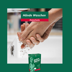 Zeigt her Eure Hände…. Für saubere und wunderbar weiche Hände haben wir einen Kaiserhack für Euch. Um Eure Hände von Schmutz und Dreck zu befreien, könnt Ihr aus 2 EL Kaiser-Natron® und ein bisschen Wasser eine Handwaschpaste anrühren und Eure Hände damit waschen. Sollten Eure Hände beim Kochen nach Zwiebeln oder Knoblauch oder auch sonst unangenehm riechen, könnt Ihr Eure Hände auch einfach mit ein bisschen Kaiser-Natron® waschen, das Ihr einfach in die Handflächen gebt und mit Wasser verreibt. Natriumhydrogencarbonat wirkt antibakteriell und neutralisiert Gerüche.