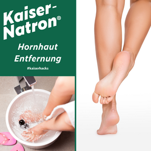 Es ist Fuß-Freiluft-Saison und die Füße bekommen endlich Tageslicht ab. Hornhaut an den Füßen kann zum einen unschön aussehen, aber vor allem kann Hornhaut Schmerzen verursachen. Mit diesem Kaiserhack könnt Ihr die Hornhaut mit einfachen Mitteln entfernen, ohne Chemiekeule oder scharfe Hobel zu benutzen. Für butterweiche Füße macht Ihr zunächst ein Fußbad mit warmem Wasser und 1 EL Kaiser-Natron®. Das Fußbad sollte mindestens 20 bis 30 Minuten dauern. Anschließend mischt Ihr 50 g Kaiser-Natron® mit etwas Oliven- oder Kokosöl zu einer Paste. Diese Paste verteilt Ihr auf die betroffenen Stellen und lasst sie 10 Minuten einwirken. Anschließend könnt Ihr die Hornhaut mit einem Peelingschwamm entfernen und die Füße mit klarem Wasser abspülen.