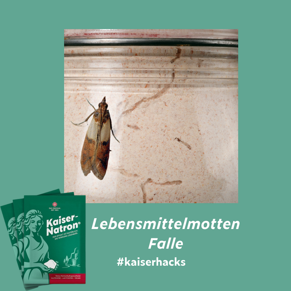 Was hilft eine gut gefüllte Vorratskammer, wenn sich Lebensmittelmotten daraus ein „All you can eat Buffet“ machen, sich genüsslich durchfuttern und für zahlreichen Nachwuchs sorgen? Die Familienplanung der Lebensmittelmotten könnt Ihr aber schnell mit einem einfachen Kaiserhack beenden. Dafür stellt Ihr eine Schale mit einem Teil Mehl und vier Teilen Kaiser-Natron® zu Euren Vorräten. Das Mehl zieht die Motten an und sie legen dort ihre Eier ab, das Natron zerstört die Eier anschließend. Natürlich müsst Ihr vorher alle von den Motten befallenen Lebensmittel entsorgen und alles (Schlitze und Regallöcher nicht vergessen) gründlich sauber machen.