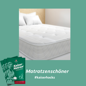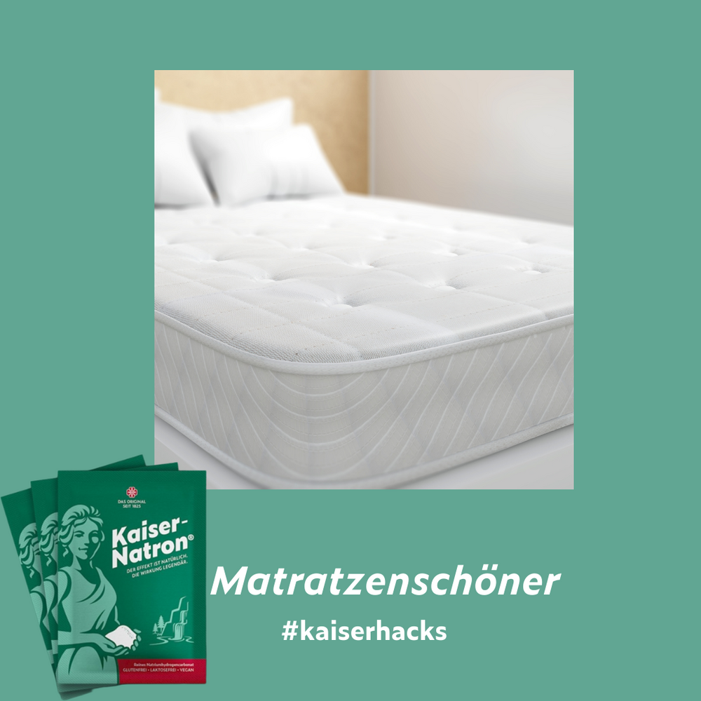 Was gibt es schöneres, als ein frisch gemachtes Bett? Damit Ihr dieses Gefühl in vollen Zügen genießen könnt, haben wir einen Kaiserhack für Euch, der frischen Wind ins Schlafzimmer bringt und Eure Matratzen porentief von hartnäckigem Mief befreit. Dazu vermengt Ihr 3 EL Kaiser-Natron® mit ein paar Tropfen ätherischen Öls Eurer Wahl und verteilt die Mischung gleichmäßig auf der Matratze. Nachdem das Natron einige Stunden gewirkt hat, könnt Ihr die Matratze vollständig absaugen. Jetzt nur noch das Bett frisch beziehen und genießen. Ihr müsst keine Angst vor Fettflecken vom Öl haben, das Natron bindet das Öl.