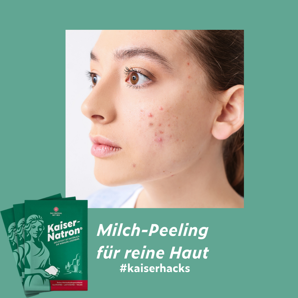 Heute kümmern wir uns um die Haut. Wusstet Ihr, dass das in Milch enthaltene Zink gut gegen Hautunreinheiten wirkt? Um Eure Haut zu pflegen, könnt Ihr aus je 1 EL Kaiser-Natron® und Milch ein Peeling anrühren, das Ihr auf dem Gesicht oder anderen betroffenen Stellen verteilt und nach 10 Minuten Einwirkzeit mit lauwarmem Wasser abwaschen könnt.