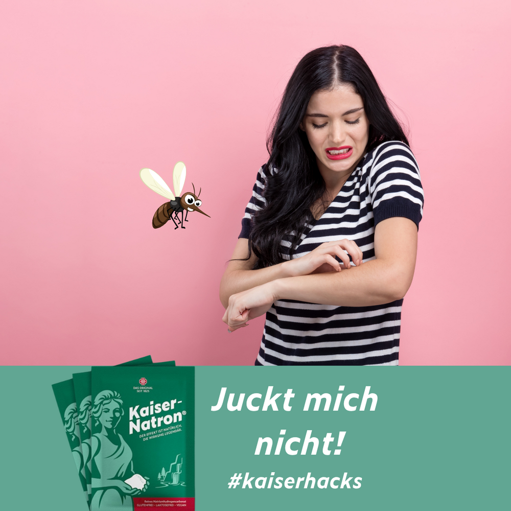 Sommerzeit bedeutet auch immer Insektenstiche. Diese können total unangenehm sein. Sie jucken, tun weh und wenn man kratzt, kann sich der Stich entzünden. Natron neutralisiert das säurehaltige Gift und lindert den Juckreiz. Wir haben zwei Behandlungsvarianten für Dich: 1. Variante unmittelbar nach dem Stich: Rühr aus etwas Kaiser-Natron® und Wasser einen Brei an, gib den Brei auf den Insektenstich und fixiere den Brei mit einem Pflaster oder Taschentuch. Lass den Brei eintrocknen und wasch mit klarem Wasser nach. 2. Variante zur späteren Behandlung: Rühr aus 1 TL Kaiser-Natron® und etwas Wasser eine Paste an, die Du 3 mal täglich auf den Stich gibst, bis der Stich verschwunden ist. Zum Glück passt der 50 g Kaiser-Natron® Beutel in jede Hosentasche und Du bist immer gegen Insektenstiche gewappnet.