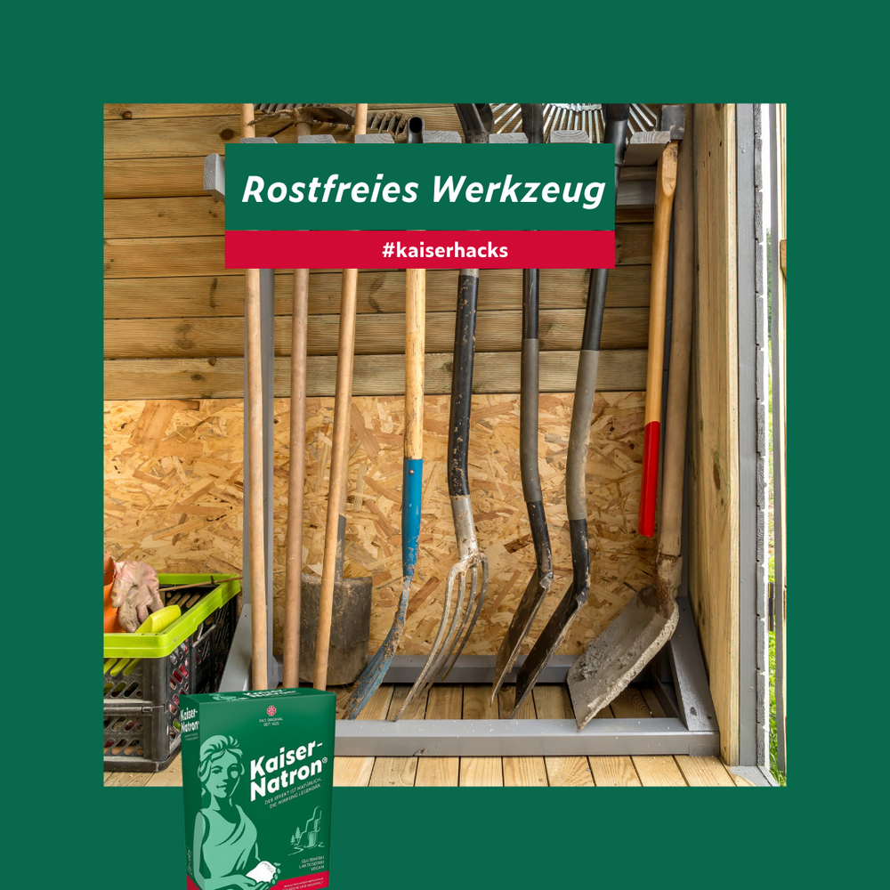 Hat Euer Gartenwerkzeug in der Winterpause auch ein bisschen Rost angesetzt? Dann haben wir pünktlich zum Start der Gartensaison einen Kaiserhack für Euch, der den Rost verschwinden lässt. Dazu feuchtet Ihr etwas Kaiser-Natron® an und gebt es auf die betroffenen Stellen. Das feuchte Natron kann gerne etwas einwirken und wird anschließend mit mehr oder weniger Druck, je nach Oberfläche, mit einem Lappen oder Schwamm verrieben. Bei hartnäckigen Flecken könnt Ihr eine Paste aus 3 Teilen Natron und 1 Teil Wasser anrühren und damit die Flecken behandeln. Beachtet aber bitte, dass es bei intensivem Reiben evtl. zu Kratzern kommen kann.