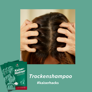 Wenn’s mal wieder schnell gehen muss, aber keine Zeit für eine Haarwäsche bleibt... Oder zur Überbrückung an den Nicht-Haare-Wasch-Tagen… Für solche Tage haben wir einen Kaiserhack für Euch, der Eure Haare auffrischt ohne viel Geld zu kosten, viel Verpackungsmüll zu produzieren oder Eure Kopfhaut und Haare mit viel Chemie zu belasten. Die Zutaten hat man eh im Haus. Für unseren Trockenshampoo-Kaiserhack benötigt Ihr 2 gehäufte EL Mais- oder Kartoffelstärke und 1 TL Kaiser-Natron®. Für blonde Haare fügt Ihr noch 1 weiteren TL Stärke, für braune Haare noch 1 TL Kakao und für rote Haare 1 TL Zimt hinzu. Alle Zutaten miteinander vermengen, im Haar verteilen, einmassieren und ausbürsten. Vielleicht habt Ihr zum Verteilen noch einen leeren Gewürzstreuer. Ihr solltet auf jeden Fall die Kleidung abdecken, da Kakao und Zimt Flecken machen können.
