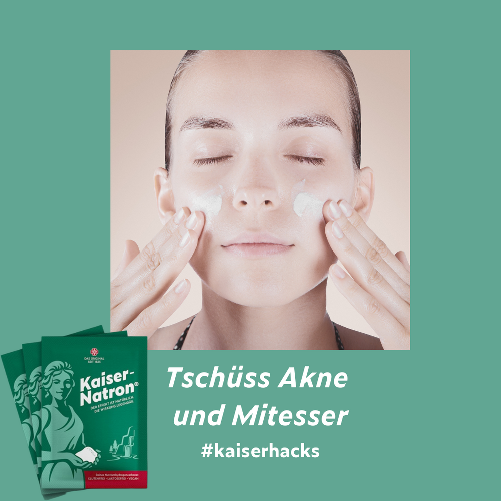Habt Ihr ab und zu Mitesser oder leidet Ihr an Akne? Dann haben wir einen #kaiserhack, wie Ihr Eure Haut an betroffenen Stellen pflegen sowie überschüssiges Fett und tote Hautschichten entfernen könnt. Ihr vermischt je ½ TL feines Salz und Kaiser-Natron® mit 1 TL milder Flüssigseife oder Waschlotion zu einem Brei. Den Brei verteilt Ihr auf den betroffenen Stellen, lasst ihn 5 Minuten einwirken und arbeitet das Peeling anschließend mit kreisenden Bewegungen in Eure Haut ein. Zum Schluss spült Ihr das Peeling mit klarem Wasser ab. Bei regelmäßiger Anwendungen haben neue Pickel keine Chance mehr.