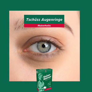 Wenig Schlaf wird durch dunkle Augenringe sofort sichtbar. Einige Menschen haben aber auch mit ausreichend Schlaf Ringe unter den Augen. Der Alleskönner Kaiser-Natron® kann aber zum Glück gegen Panda-Augen helfen. Ihr löst ½ TL Kaiser-Natron® in 100 ml lauwarmem Wasser auf. 2 Wattepads eintauchen, ausdrücken, auf den Bereich unter dem Auge legen und 10 bis 15 Minuten einwirken lassen. Die Augenringe sind ausradiert und Ihr könnt in den Tag starten. Wir wünschen Euch ausreichend und erholsamen Schlaf.