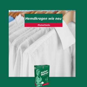 Ihr vermischt Ihr 1 EL Kaiser-Natron® mit 1 EL Essig zu einer Paste, diese streicht Ihr auf die vergilbten Stellen am Hemdkragen und lasst dies 10 Minuten einwirken. Anschließend wascht Ihr das Hemd wie gewohnt in der Waschmaschine. Bei Seide bitte auf diesen Kaiserhack verzichten.
