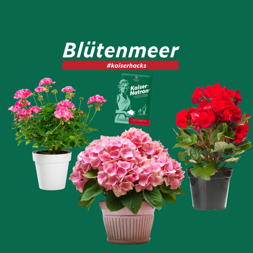 Wir lieben einen Garten und Balkon voller blühenden Pflanzen und tollen Farben. Damit die Blütenpracht von Geranien, Begonien und Hortensien zum Blühen angeregt wird, könnt Ihr die Pflanzen mit Kaiser-Natron® düngen. Dazu löst Ihr 1 EL Kaiser-Natron® in 2 Liter Wasser auf und gießt damit einmal pro Monat Eure Pflanzen. Freut Euch auf ein Blütenmeer.