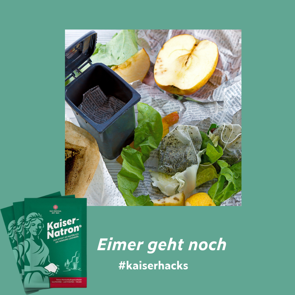 Wenn es nun immer wärmer wird, wird der Geruch der Biomülltonne immer intensiver. Damit Ihr und die Mitarbeiter der Müllentsorgung nicht durch unangenehme Gerüche belästigt werdet, haben wir einen erfrischenden Kaiserhack für Euch. Nach der Leerung der Biomülltonne reinigt Ihr diese gründlich mit dem Gartenschlauch und Essig. Nachdem die Mülltonne vollständig getrocknet ist, legt Ihr den Boden mit reichlich Zeitungspapier aus und streut 2 EL Kaiser-Natron® über das Zeitungspapier. Das Natron wirkt geruchsneutralisierend und bindet zudem Feuchtigkeit. Auf diese Art und Weise könnt Ihr den Fliegen die Biomülltonne unattraktiv machen. Fliegen mögen es feucht, warm und stinkend, um dort Eier abzulegen und Eure Biomülltonne von Maden bevölkern zu lassen. Achtet deswegen immer darauf, dass feuchter Bioabfall gut abgetropft entsorgt wird, die Mülltonne im Schatten steht und immer verschlossen ist.